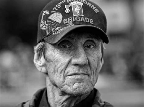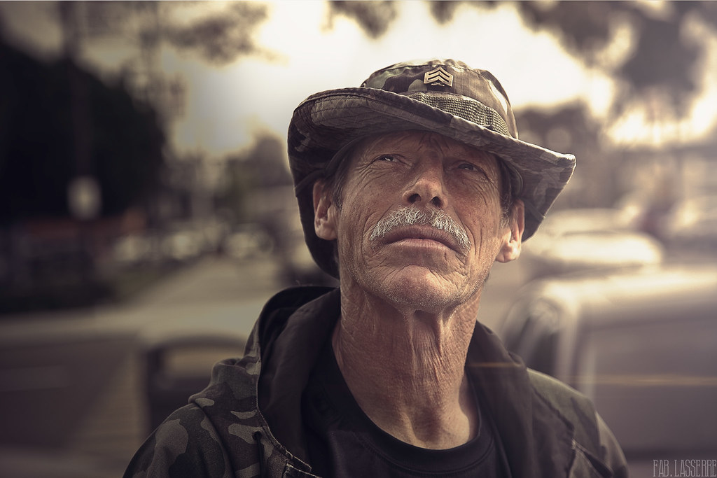 Shuffling outside with just a little pride, an old private, a bag at his side